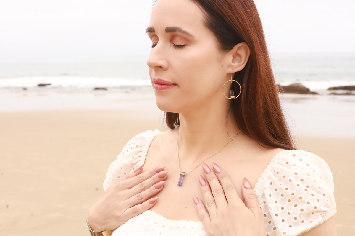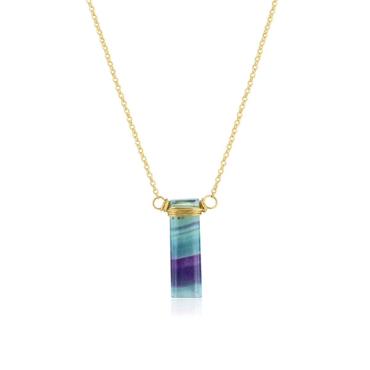 A stunning, high quality natural fluorite bar is wrapped with a perfectly proportioned halo of 14k  gold filled wire suspended from delicate, yet sturdy 14k gold filled chain.