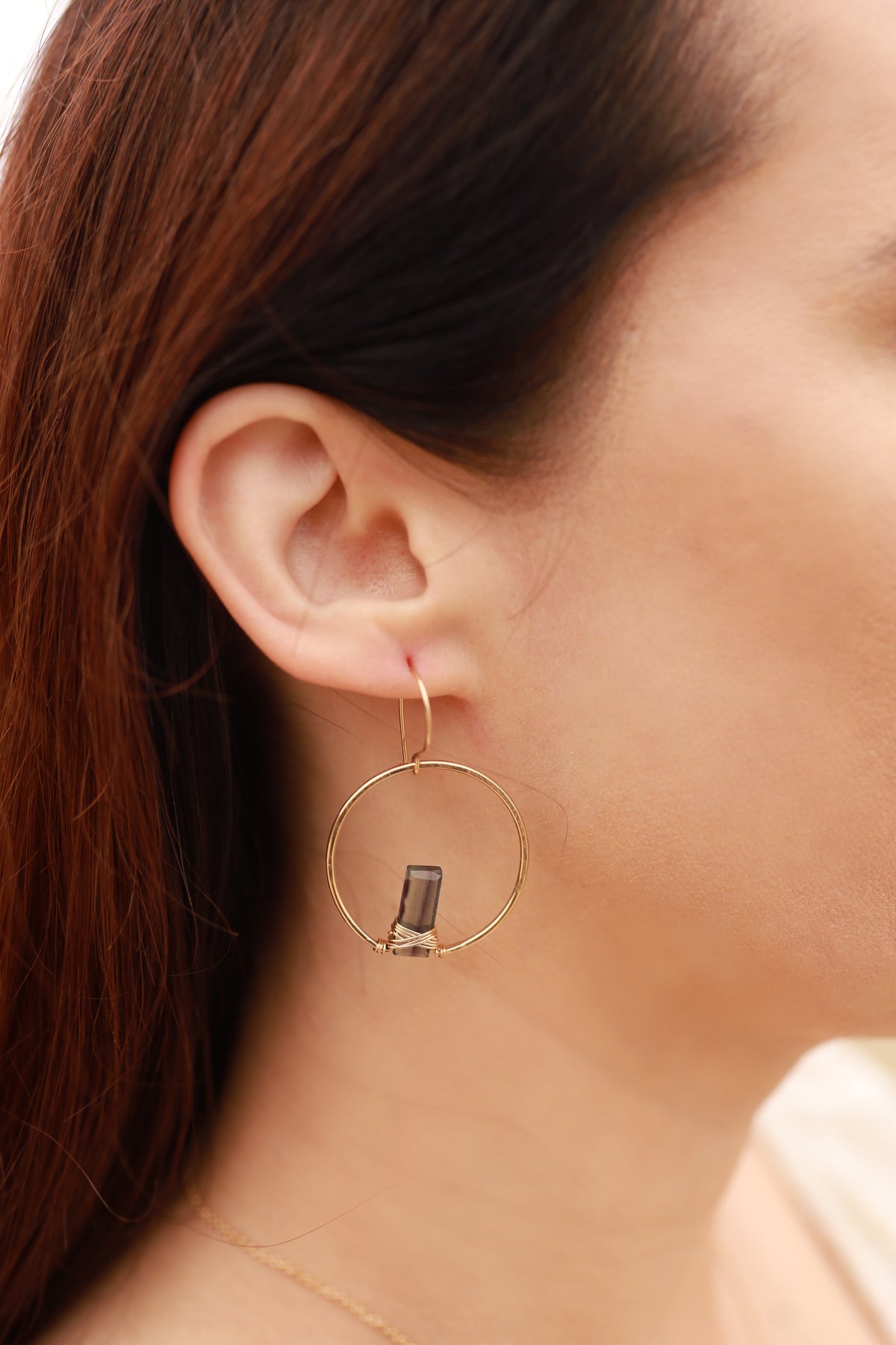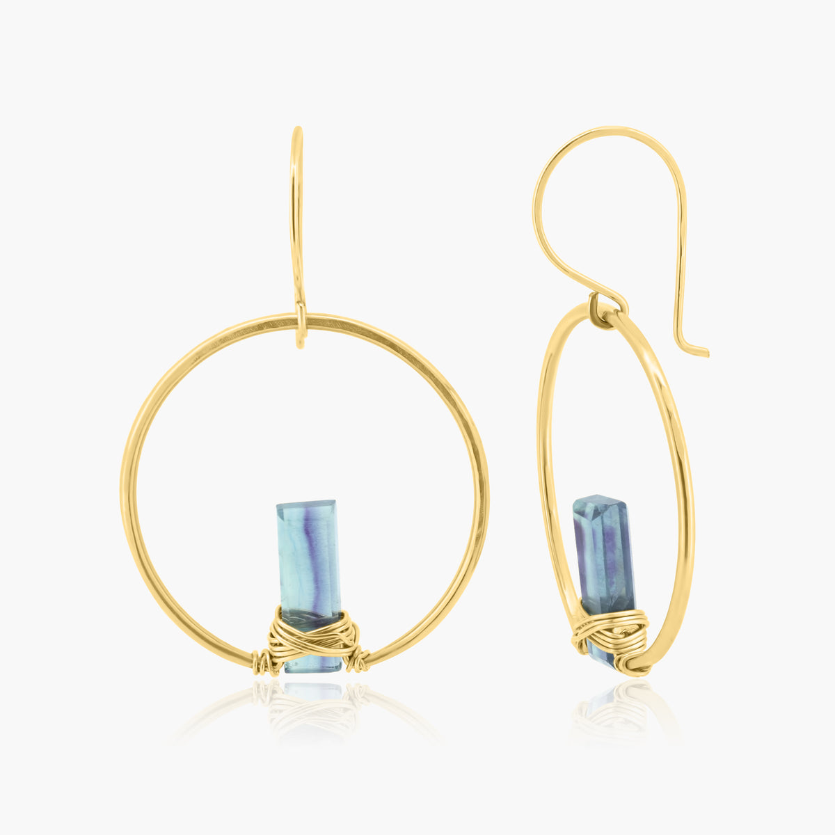 These fluorite earrings are sturdy, hand formed hoops wrapped in a perfect halo around custom cut, genuine fluorite bars. The bars are securely set into the 14k gold hoops and wrapped in14k gold filled wire, creating a gorgeous pair of healing earrings.