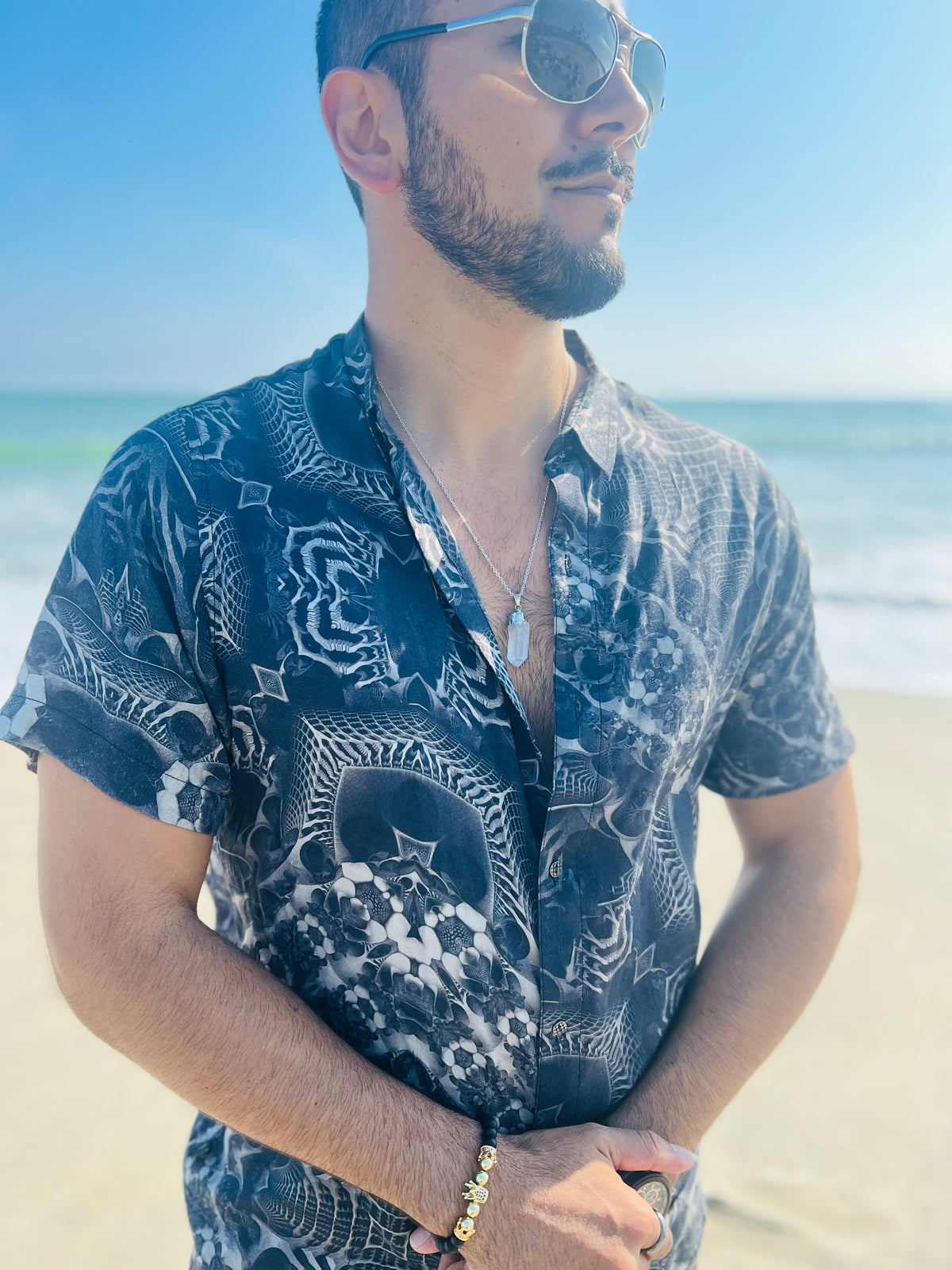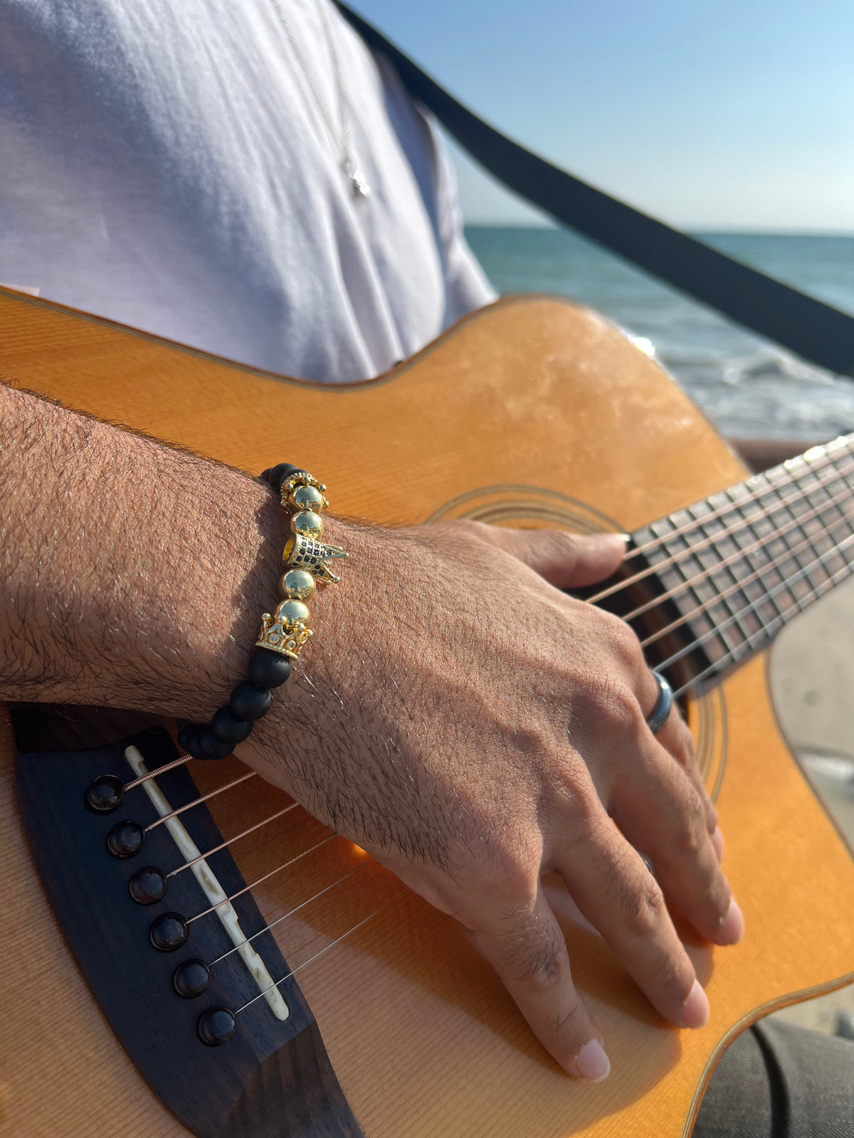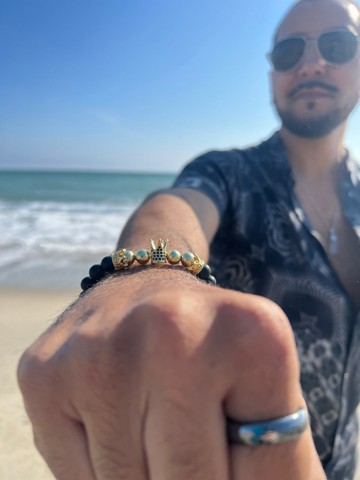 Embody big King energy with this black onyx beaded bracelet, known as the stone of strength. Gold plated, lightweight and durable with an elasticity for one size fits all. This piece makes a great gift for a husband, father, son or grandfather.