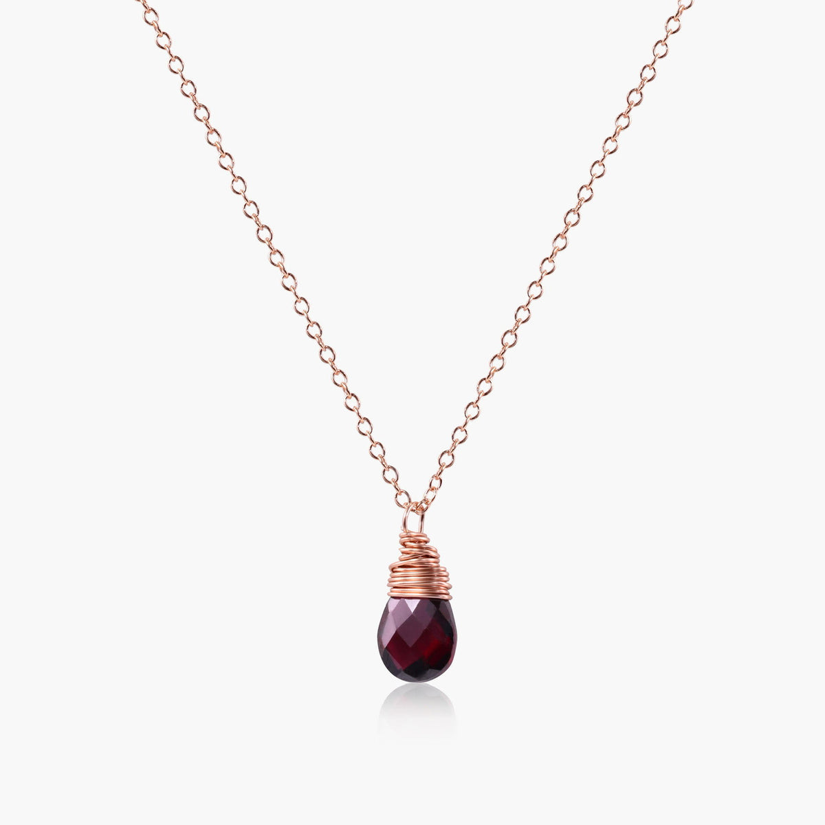 This outstanding solitaire features a nicely sized aaa Mozambique Red Garnet briolette. This stone is rich in color, wrapped in gold filled wire and suspended from a 14k rose gold filled chain. Red Garnet is the birthstone of January. It’s Named from the seed of the pomegranate, granatum. Garnet is an energizing and regenerating stone. It was traditionally used for engagement rings because it inspires love and devotion. Red garnet open’s the heart chakra, balances the sex drive and alleviates emotional disharmony.