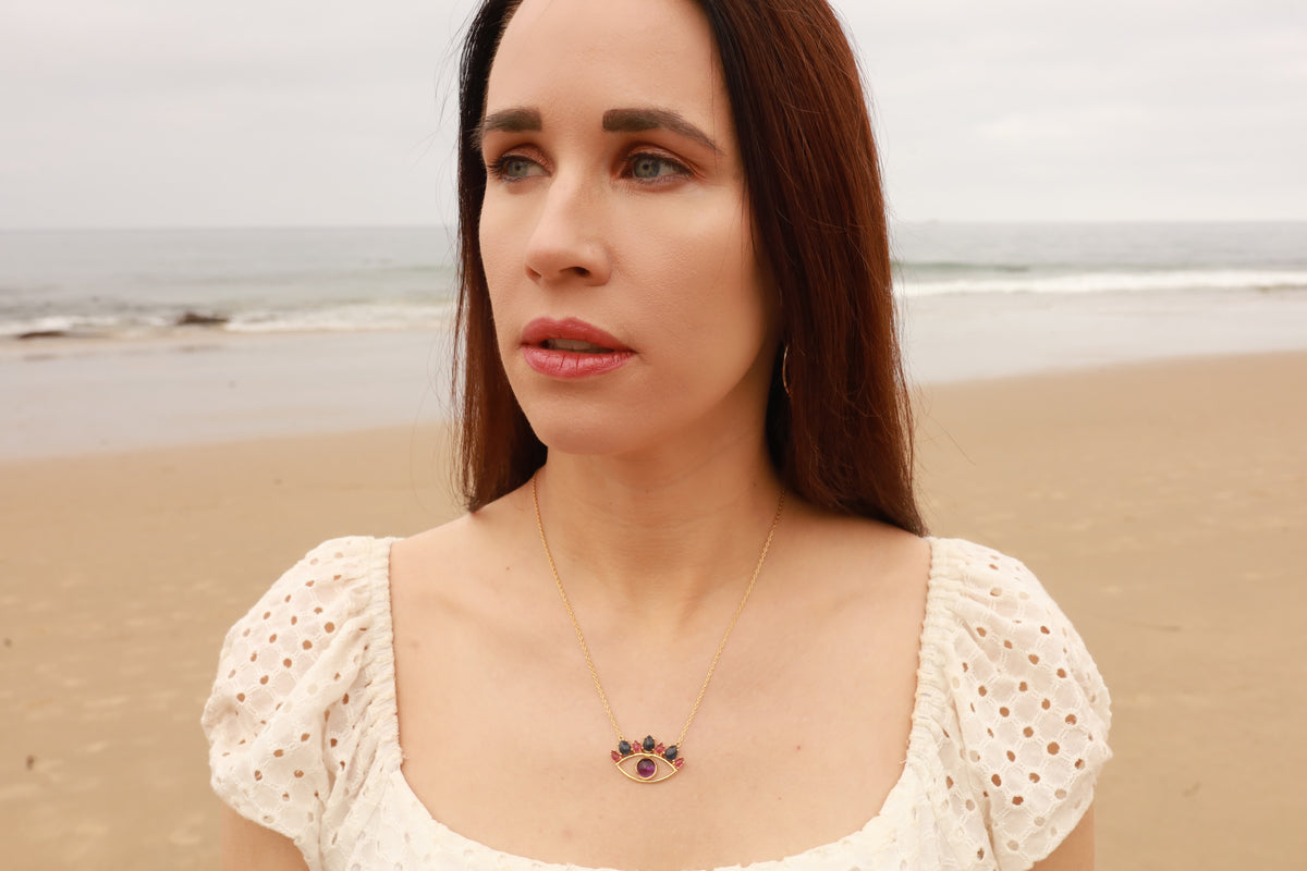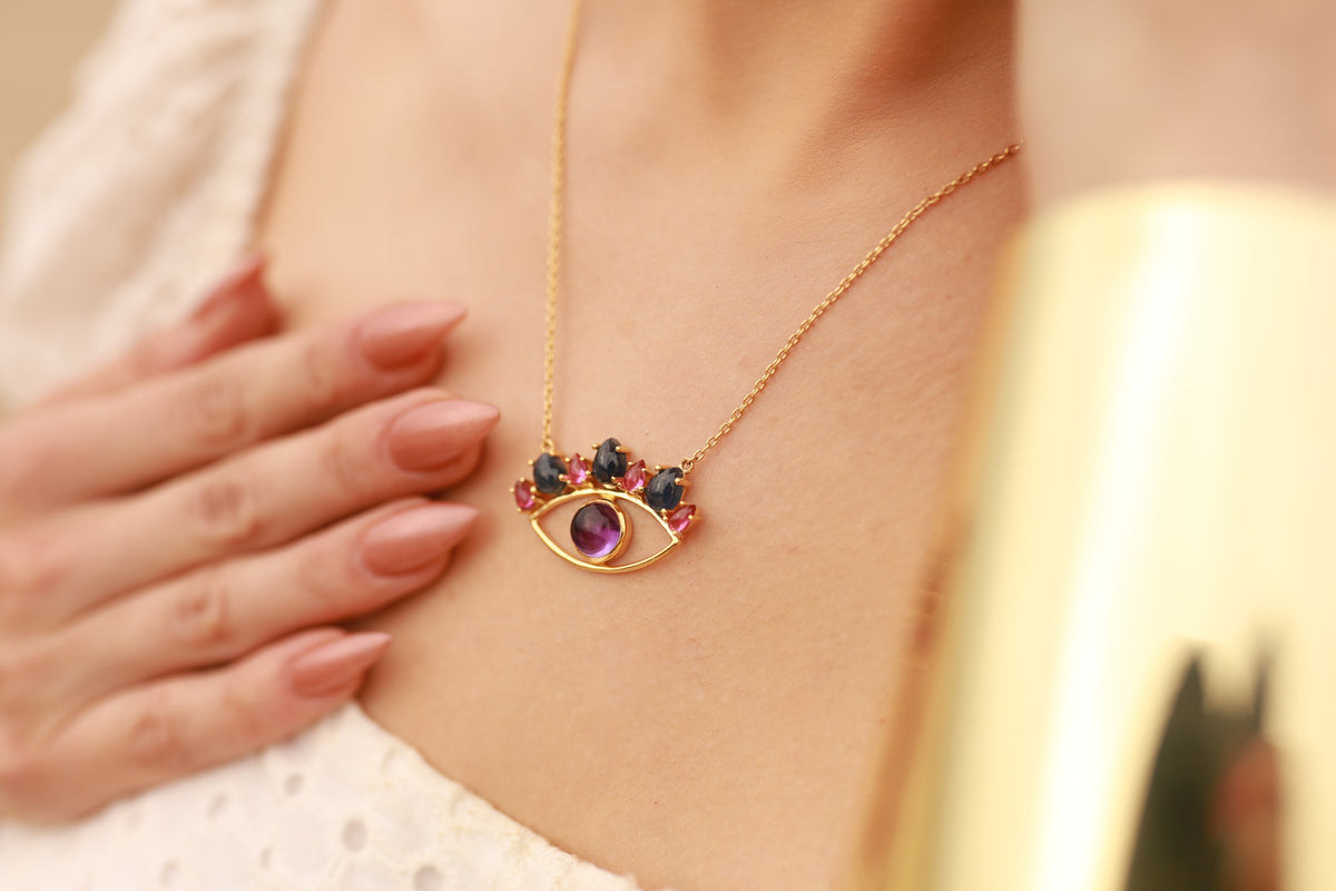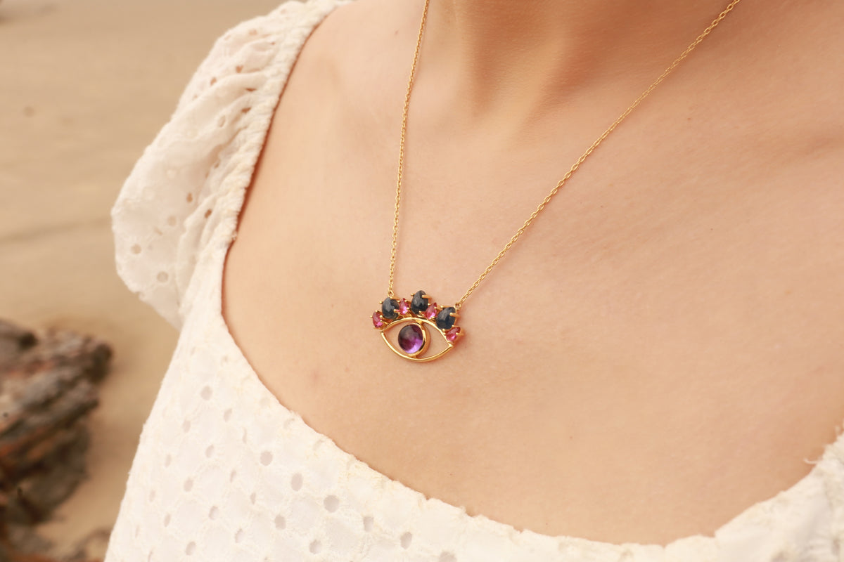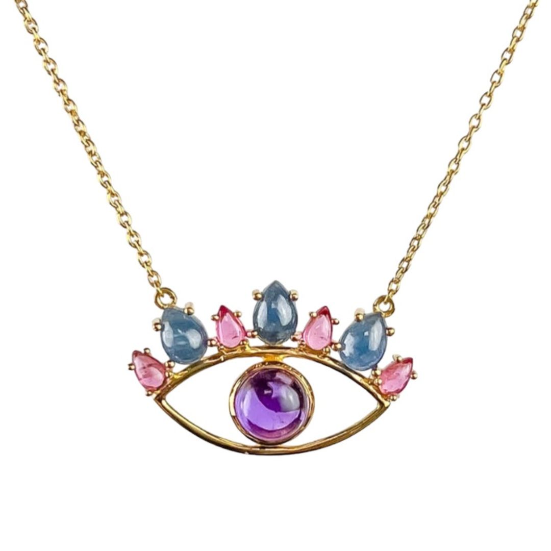 This is a 14k Gold Filled Evil Eye necklace. This piece features a pendant adorned with sparkling amethyst, blue sapphire and pink tourmaline gemstones. The evil eye design protects the wearer from projected negative energy.