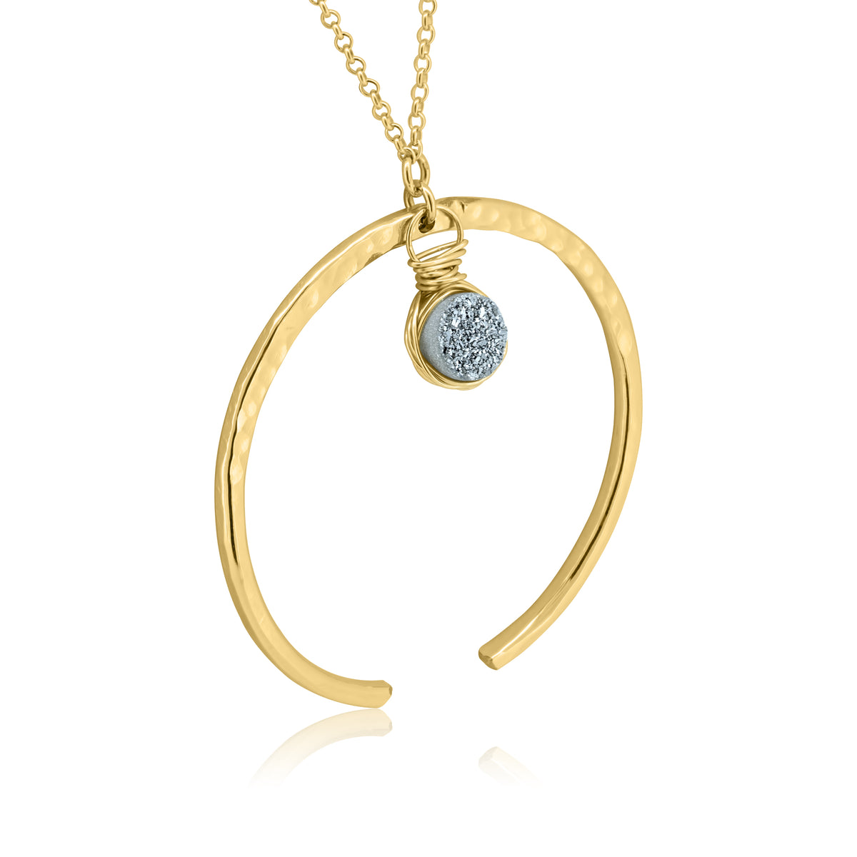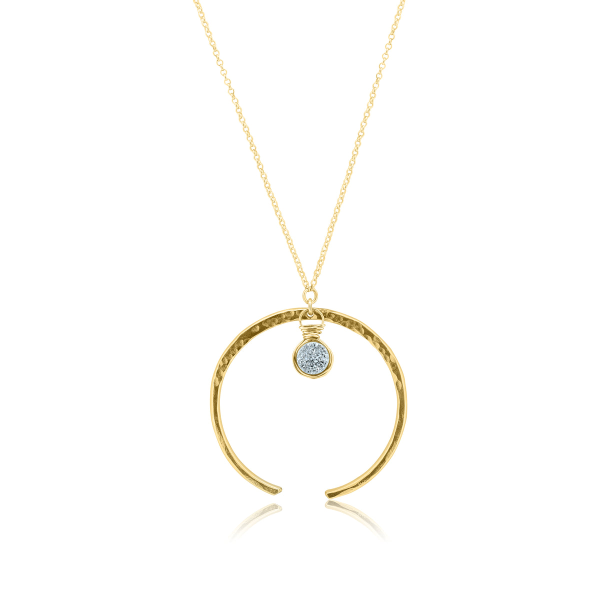 This necklace features a handmade crescent moon pendant shaped around a sparkling druzy crystal. Druzy crystal is a powerful stress reliever that brings healing on a physical, mental and spiritual level. It stimulates the imagination and awakens one to a feeling of self love and empowerment. It balances the emotional body to relieve stress, depression, sadness and fear. It is recommended to wear this necklace on the night of a new moon.